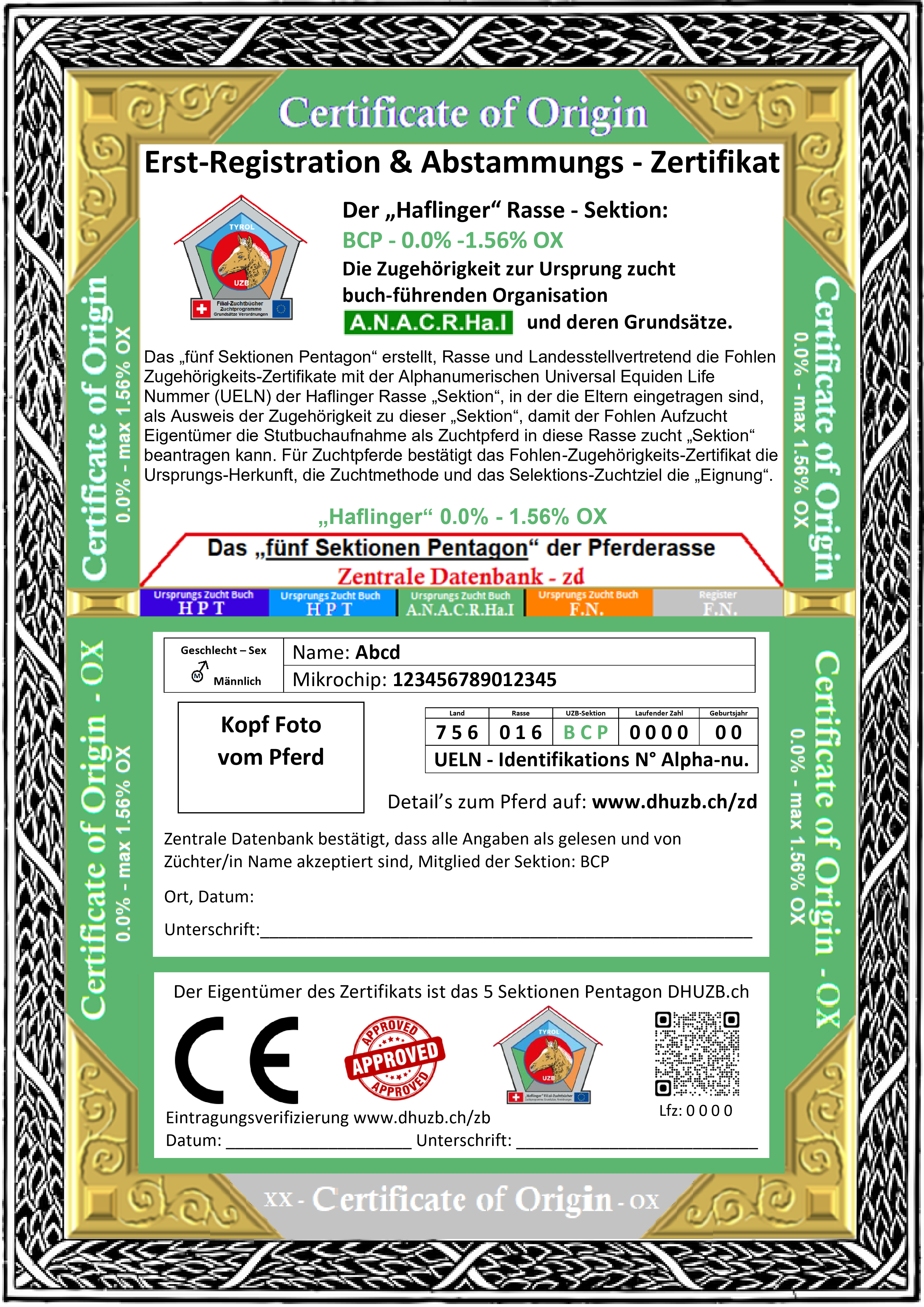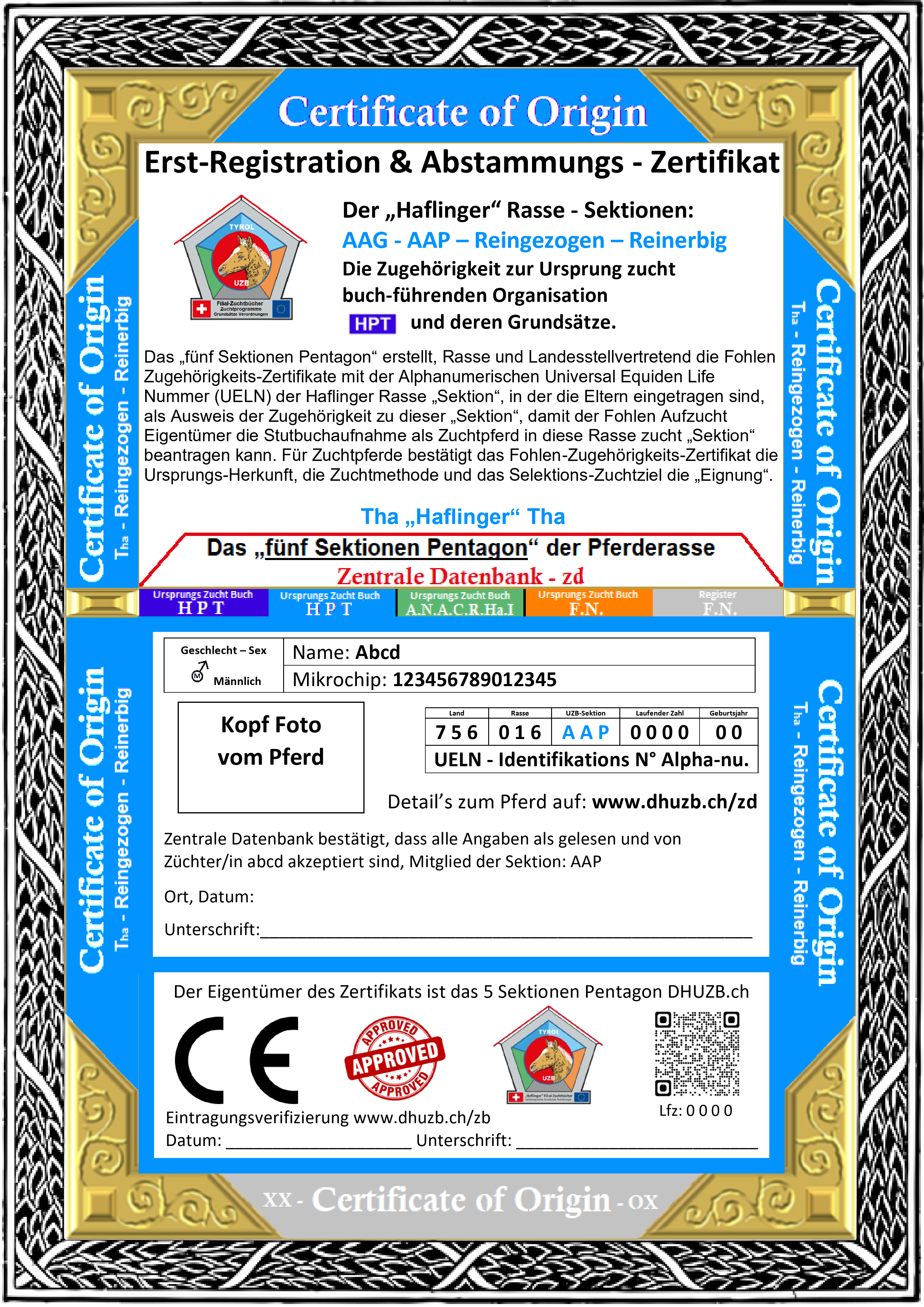 Die HAFLINGER Rasse-Sektionen sind durch die alphanumerische UELN-Sektions-Nummer und den entsprechenden „Certificate of Origin“ erkennbar.